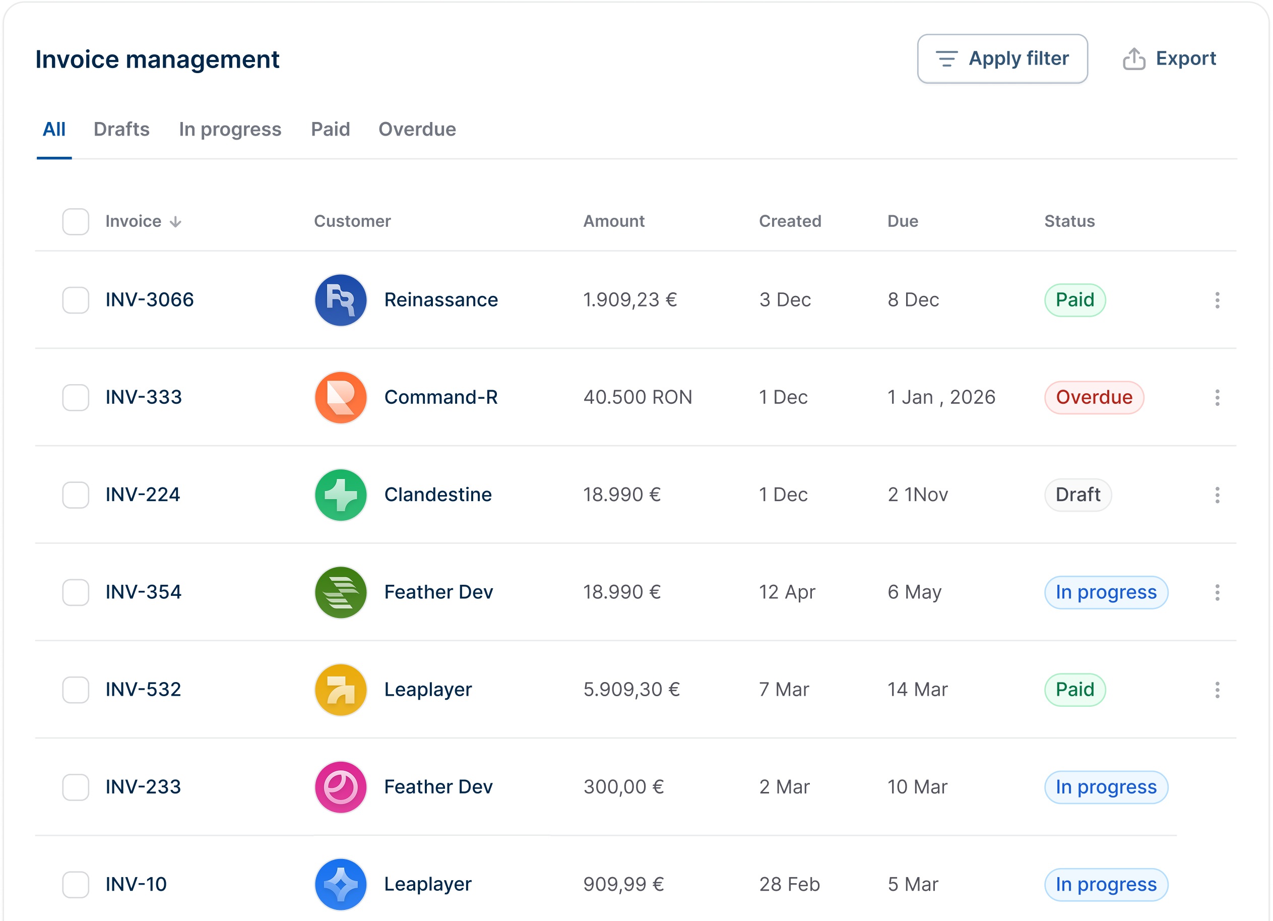 • Statusuri evidente (Draft, Trimise, Achitate, Restante)