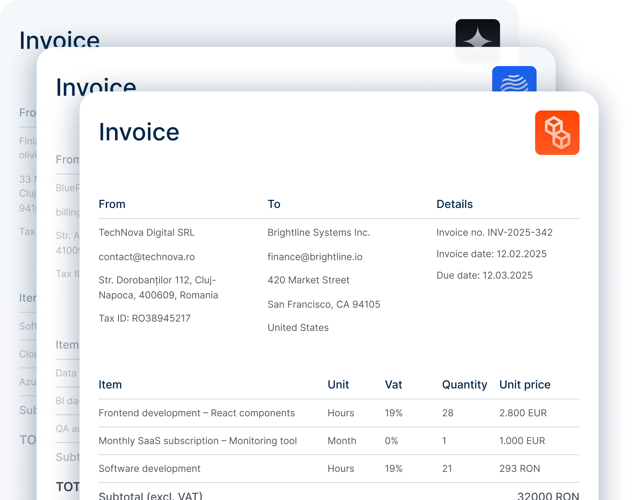 Creezi facturi professionale în câteva secunde, complet conforme și gata de trimis clienților tăi. Totul este automatizat — fără template-uri greoaie sau editări repetate.